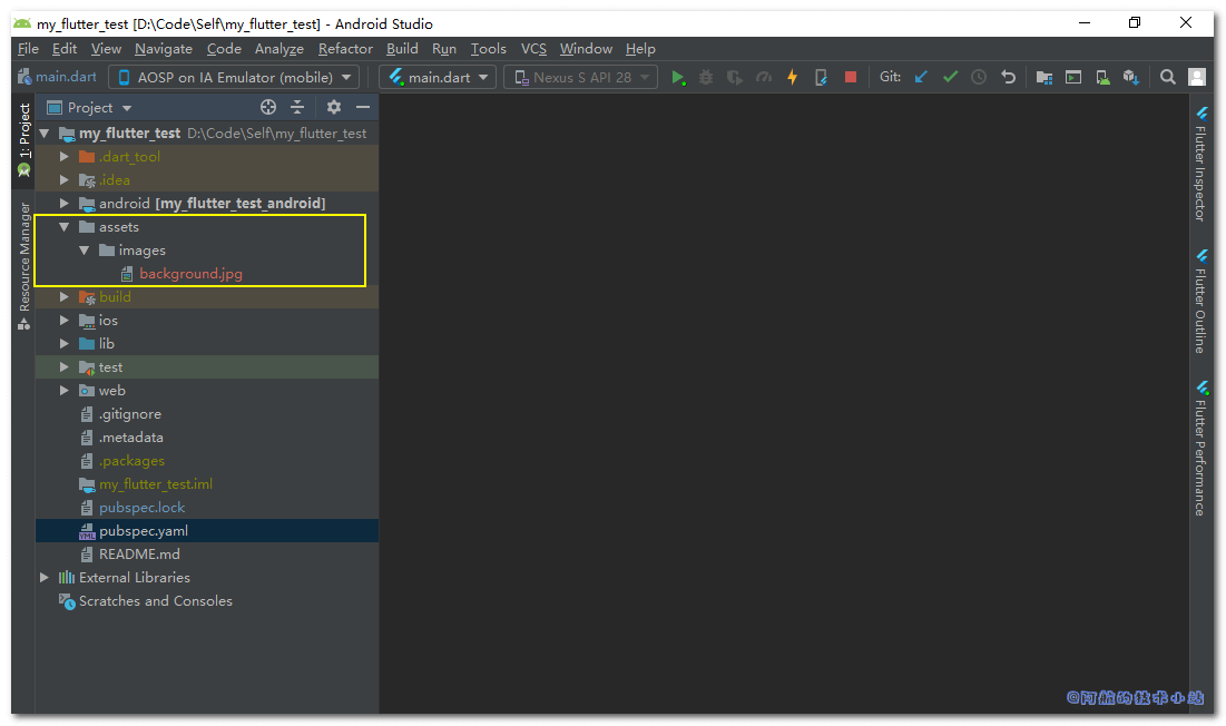 进入pubspec.yaml, 将背景图片资源文件路径assets/images/background.jpg进行导入: